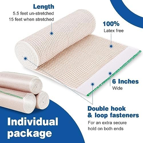 🎁【Individually packed】The individually packaged 2 packs compression elastic bandage is a perfect complement to the first aid kit and home wound care products. Our bandages are a standard length of 5 feet, and the stretched length is 15 feet for maximum coverage. And is easy to store and carry.