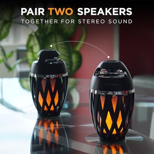 This indoor/outdoor portable speaker offers up to 9 hours of continuous playtime from any wireless compatible device. The warm LED ambient light emits a flickering, atmospheric light providing the perfect ambiance for evenings spent outdoors or a cozy night in. Pair up to two speakers using dual sync capabilities from a maximum distance of 30 feet for a true stereo-sound.